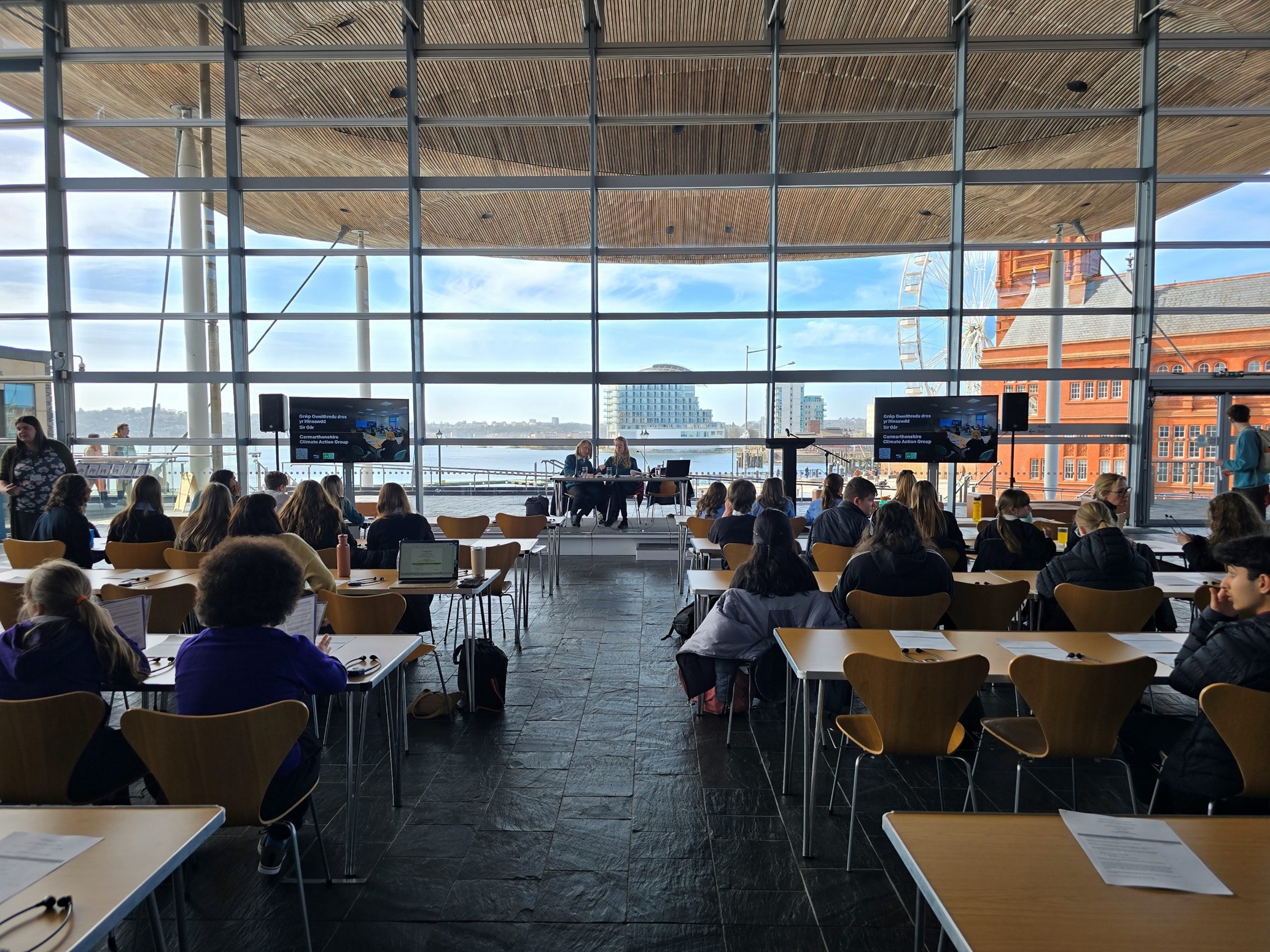 Pupils from five secondary schools and two primary schools in Carmarthenshire have been to the Senedd in Cardiff to address climate change and promote sustainable solutions.